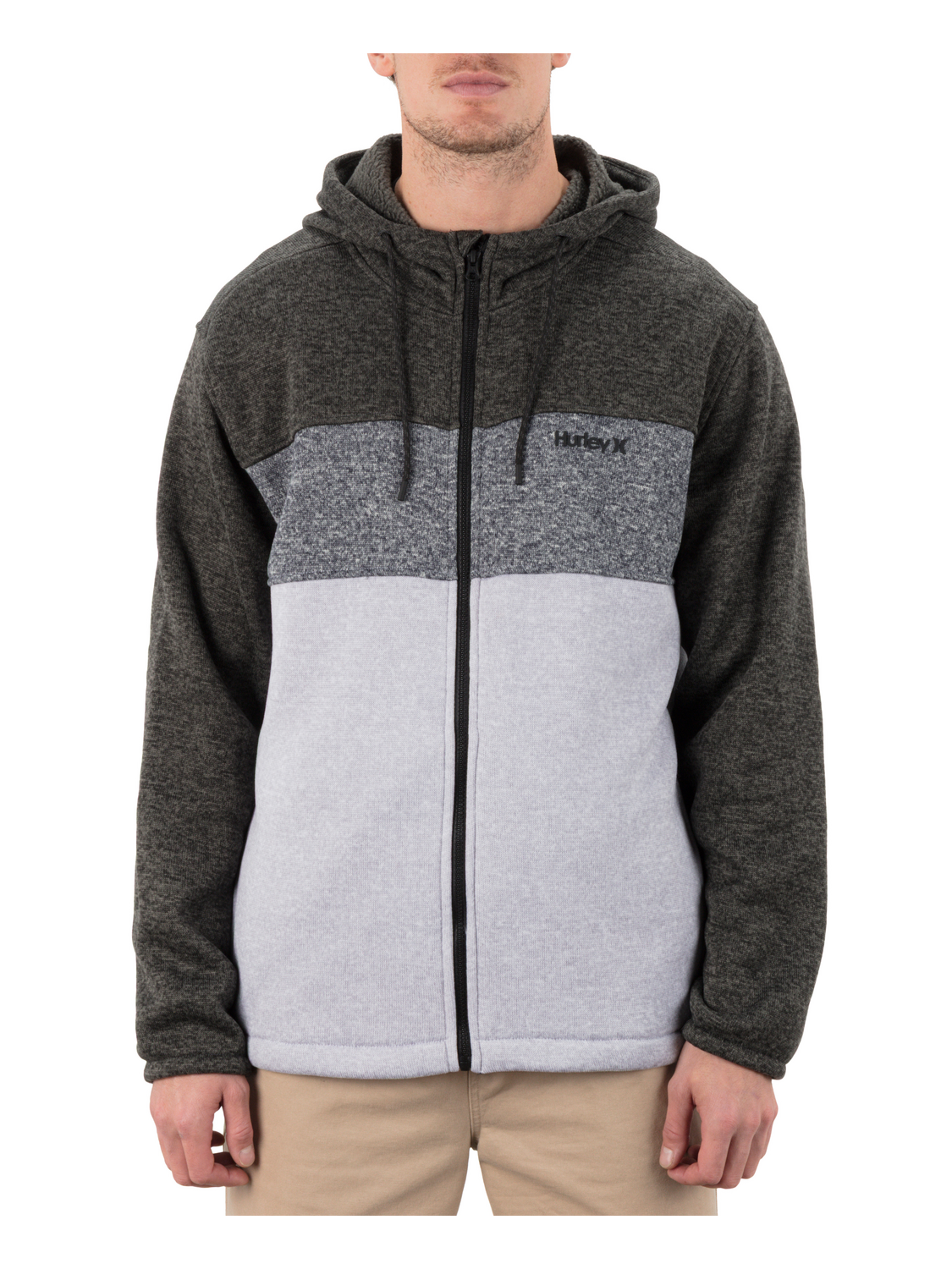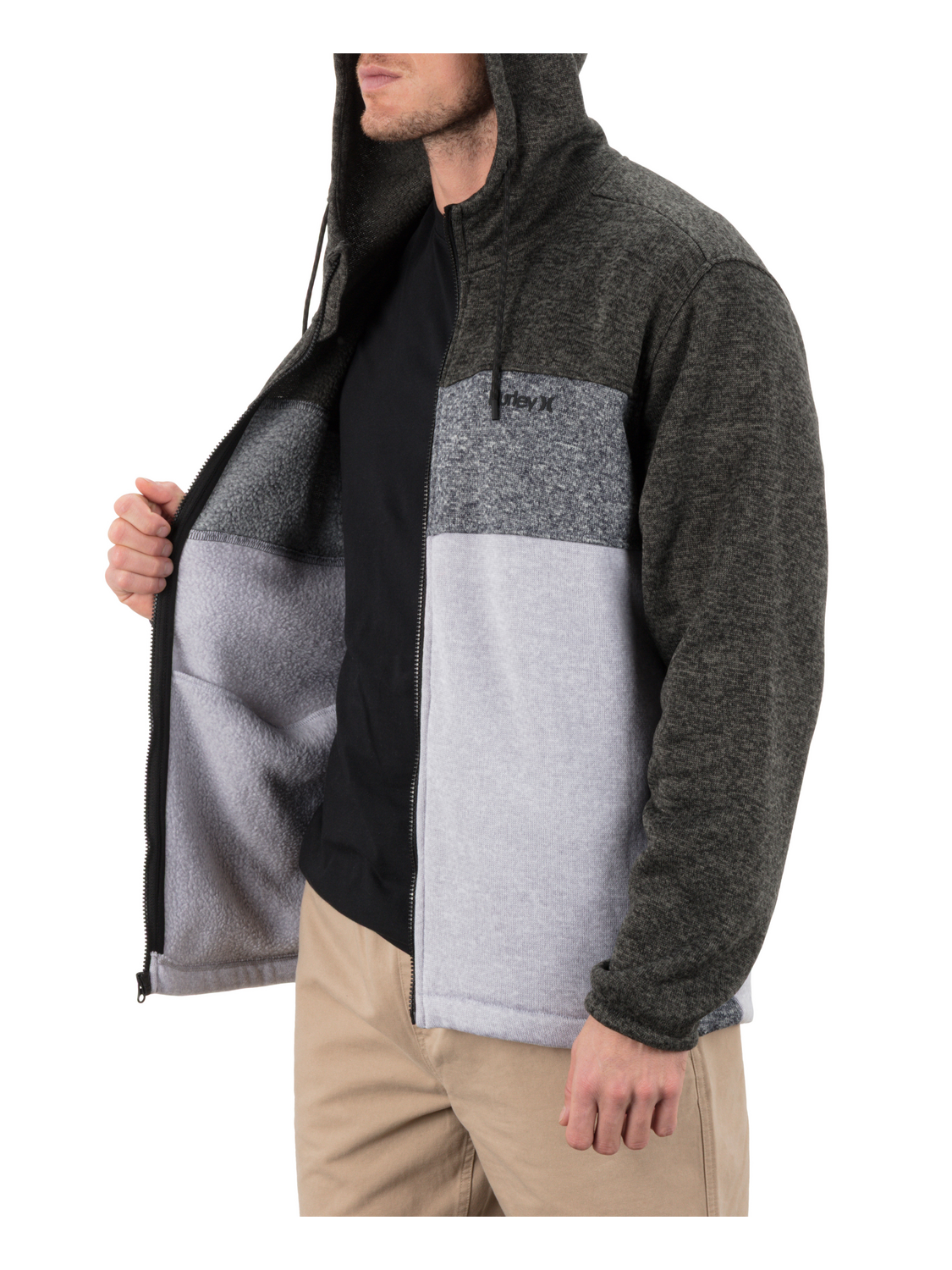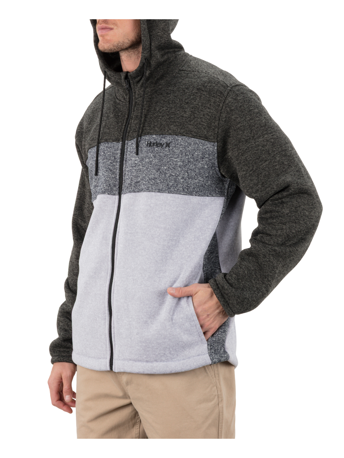 - Hooded full zip silhouette with drop tail hem.
