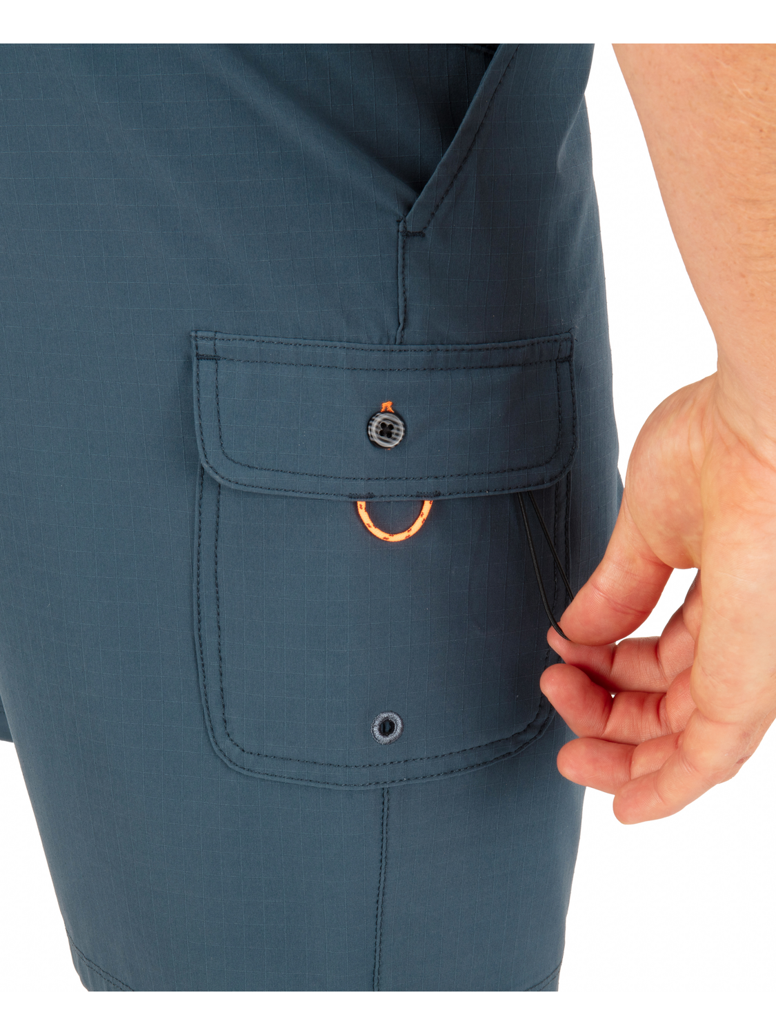 • Side pockets with mesh pocket bags for drainage and side cargo pocket with button closure at wearers right thigh.