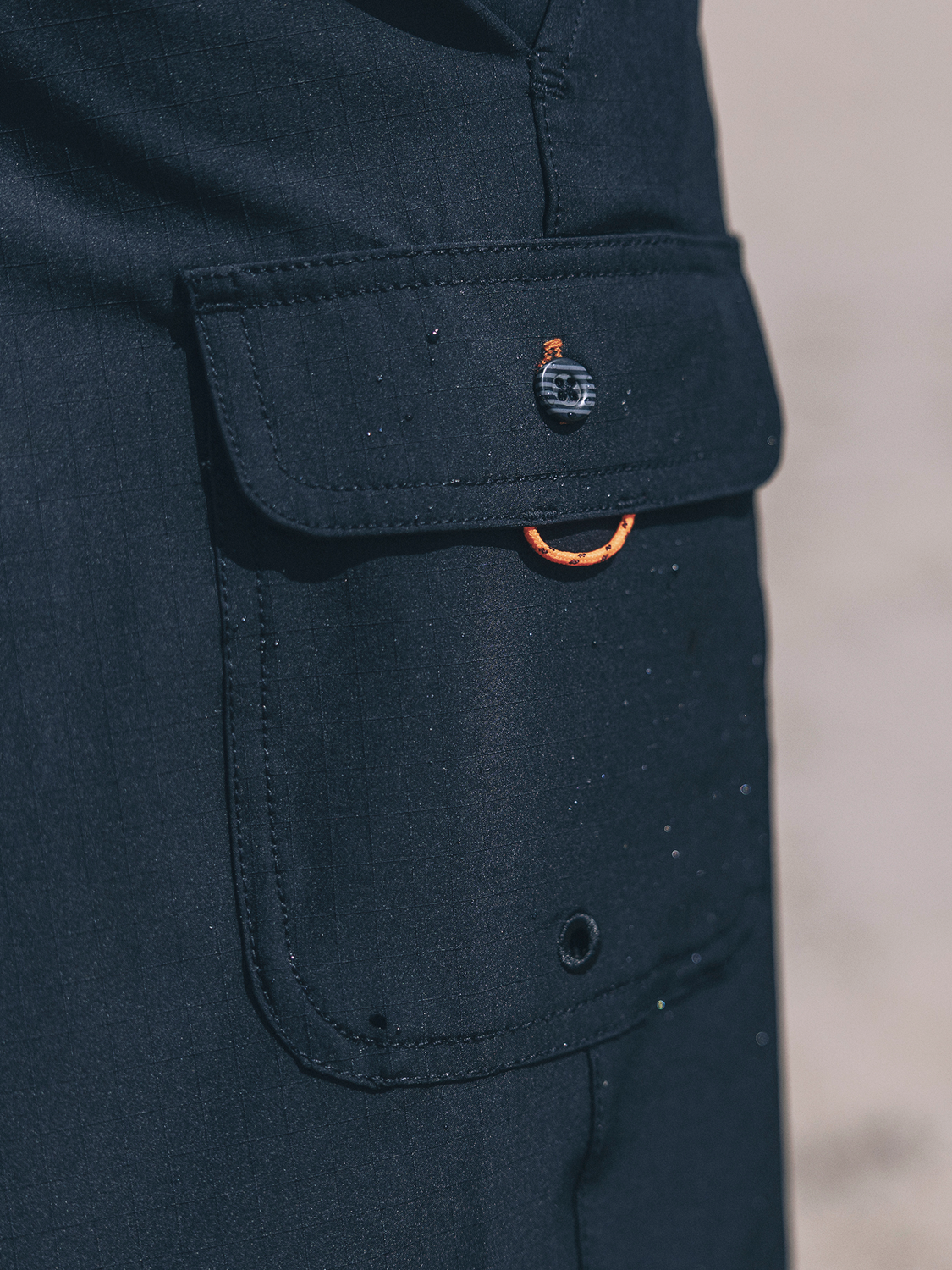 - Side pockets with mesh pocket bags for drainage and side cargo pocket with button closure at wearers right thigh.