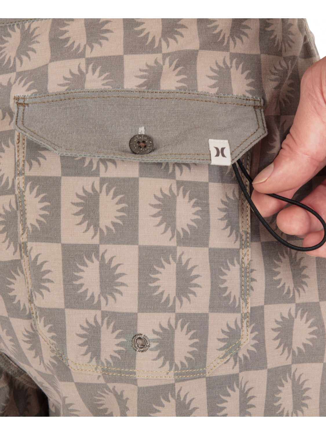 • Back pocket with button closure.