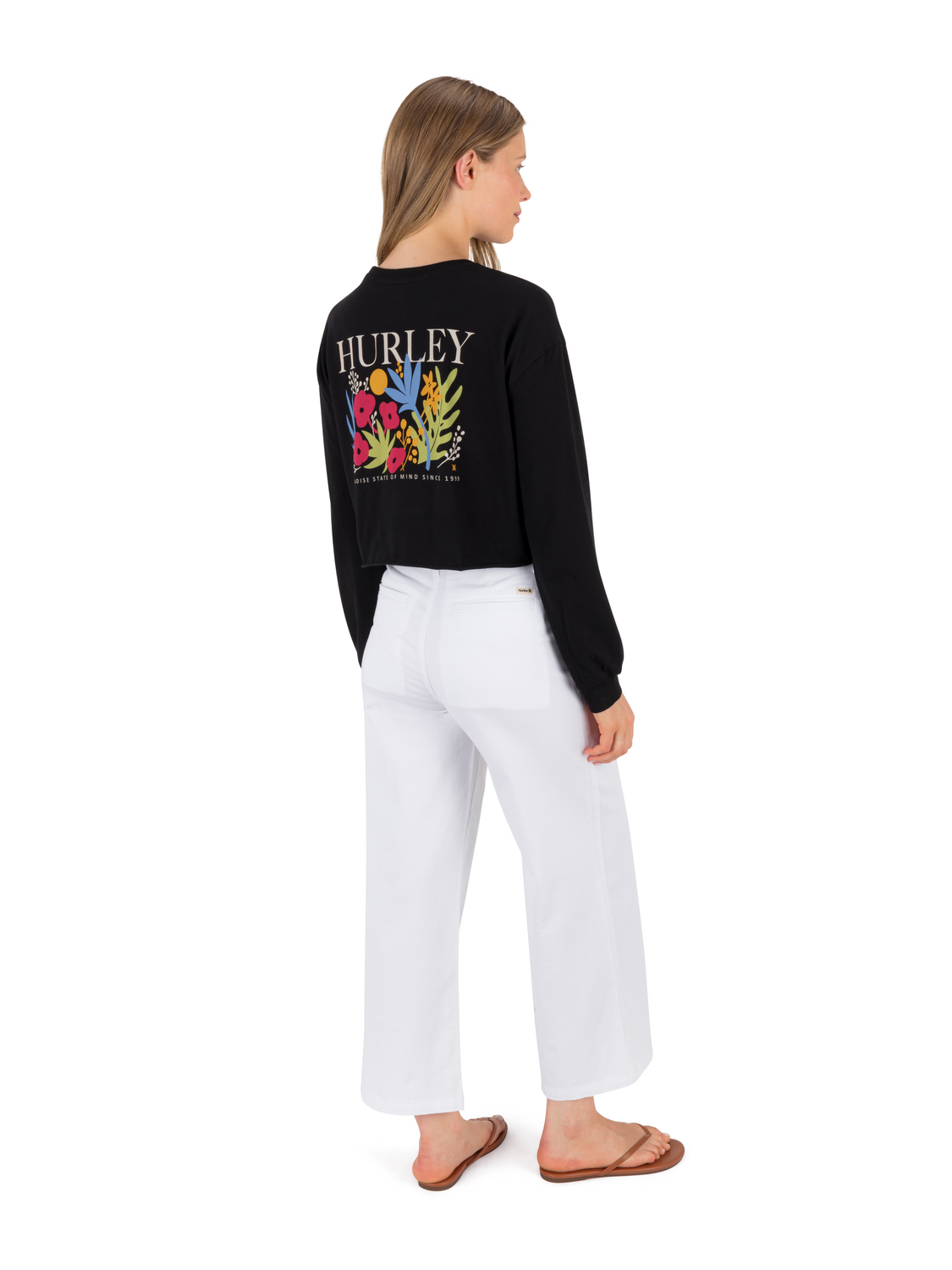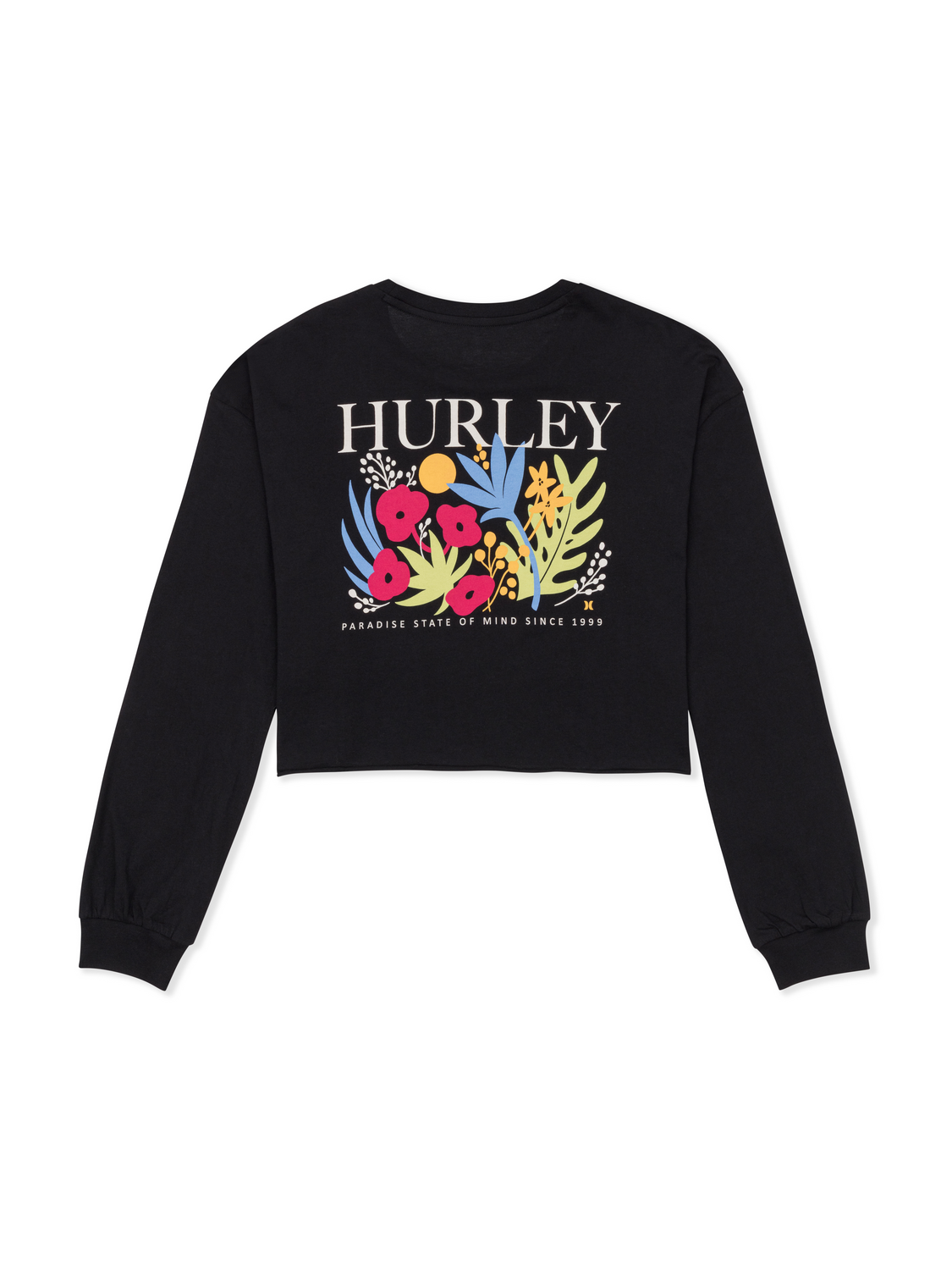The Floreal Long Sleeve Crop Tee features a raw cut hem and pixel-style back print that gives classic florals a bold, graphic twist.